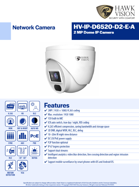 The Hawk Vision HV D6520D2-E-A 2.4MP IP Dome Camera with Built-in Microphone is designed to provide high-definition surveillance along with audio monitoring for improved security and situational awareness. Delivering 2.4MP high-resolution video output, the camera captures clear and detailed footage, ensuring precise monitoring of indoor environments.