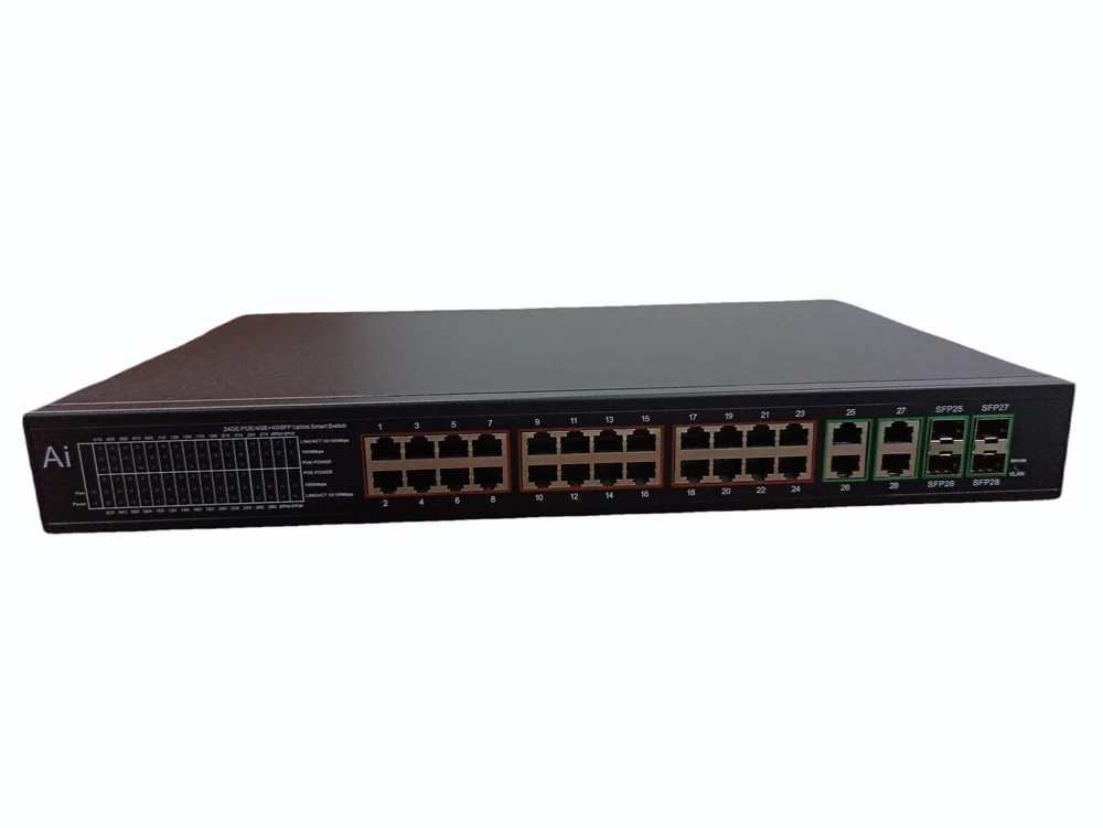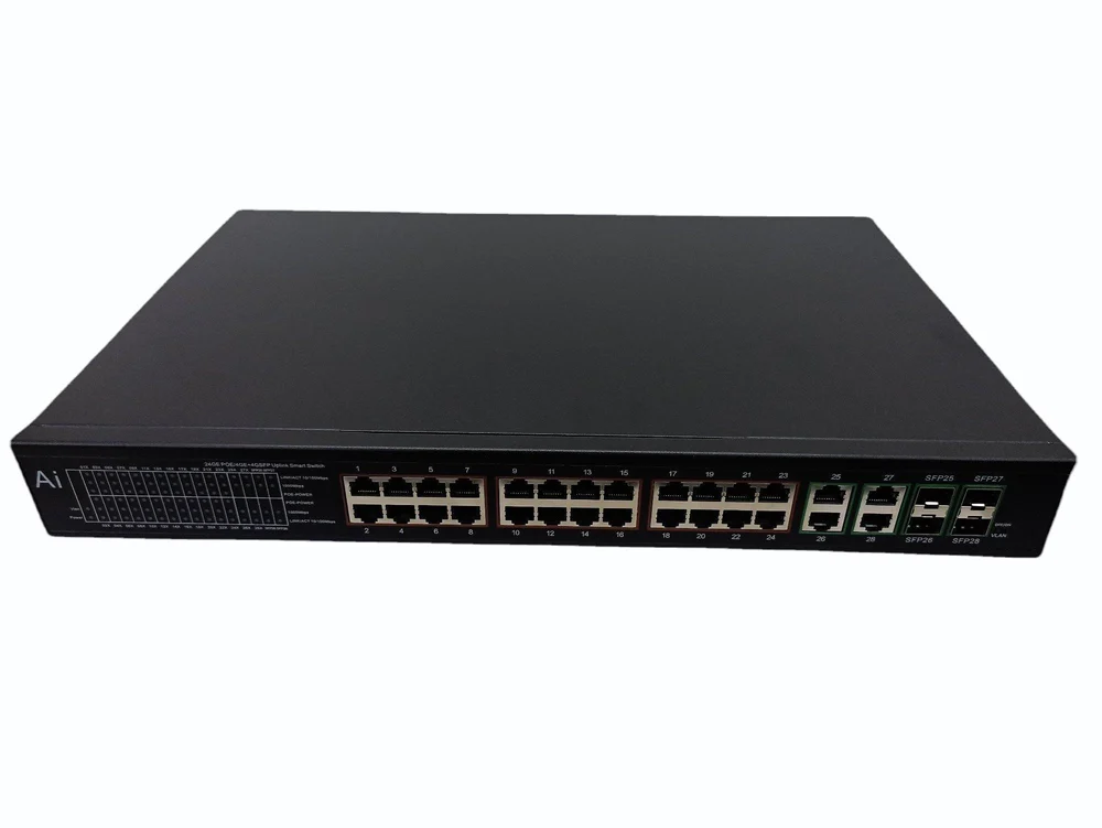 The 24 Port PoE + 2 SFP Switch is a robust and scalable networking device designed for large-scale installations that require both power over Ethernet and extended network reach. Equipped with twenty-four PoE ports and two SFP fiber uplink ports, this switch allows users to connect and power multiple devices such as IP cameras, wireless access points, and VoIP phones without the need for separate power supplies. The dual SFP ports enable long-distance data transmission through fiber optic cables, making it suitable for campus networks, industrial environments, and outdoor surveillance systems. Supporting IEEE 802.3af/at standards, the switch ensures compatibility with a wide range of PoE-enabled devices. Its plug-and-play functionality allows quick and easy installation without any configuration. Intelligent power management automatically detects connected devices and supplies the required power while protecting against overload, short circuits, and voltage fluctuations. The switch ensures stable and uninterrupted data transmission, making it ideal for CCTV systems, enterprise networks, and commercial applications. Designed with a durable metal chassis and energy-efficient technology