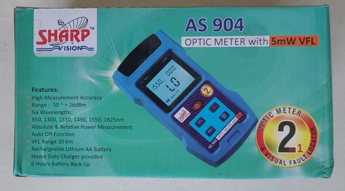 The AS 904 Power Meter with VFL is an advanced optical testing instrument engineered to provide precise measurement of optical signal power along with effective fault detection in fiber optic networks. It combines the functionality of an optical power meter and a Visual Fault Locator (VFL), enabling technicians to measure signal strength and visually locate faults such as fiber breaks, bends, and connector issues. This makes it an ideal tool for FTTH deployment, telecom maintenance, and fiber network troubleshooting.