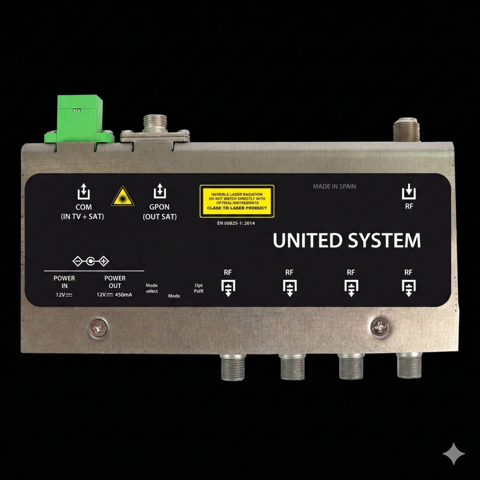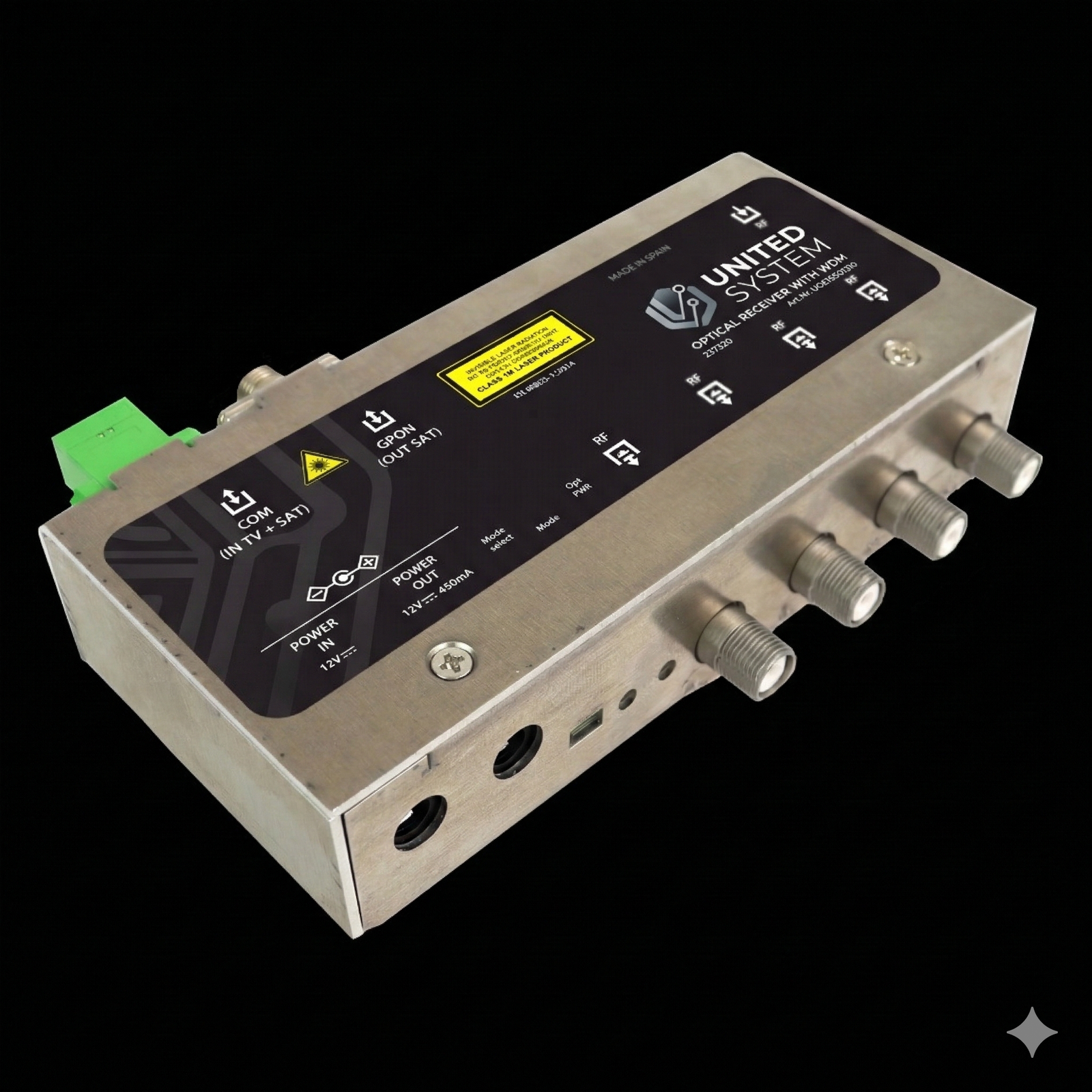 The FTTH Node 4 O/P Metal 1310 is a high-performance fiber optic receiver designed for FTTH and CATV signal distribution systems. It receives optical signals at 1310 nm wavelength and converts them into RF signals, providing four RF output ports for distributing signals to multiple televisions or network points.