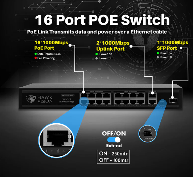 Hawkvision HV-X1602-PS-FG 16+2+1 Full Gigabit PoE Switch – 16x Gigabit PoE ports + 2x Gigabit uplink + 1x Gigabit SFP uplink, IEEE 802.3af/at, 250W budget, VLAN support for high-capacity IP camera, surveillance, and network powering.