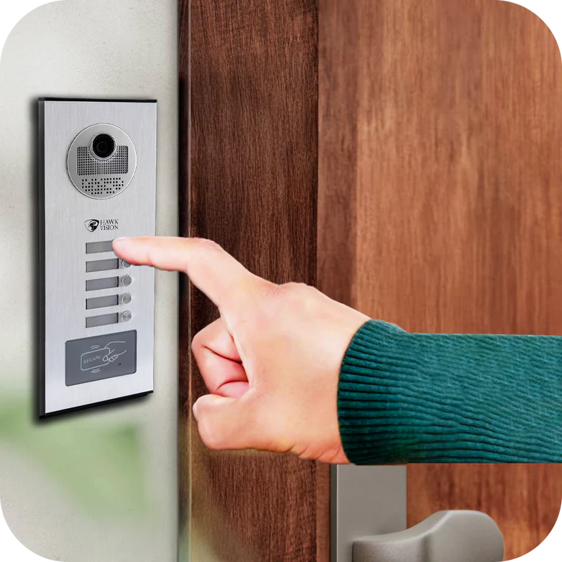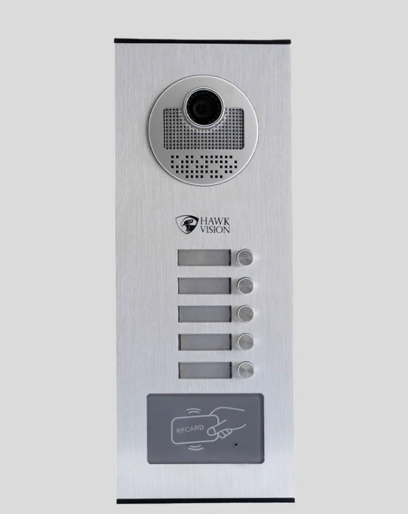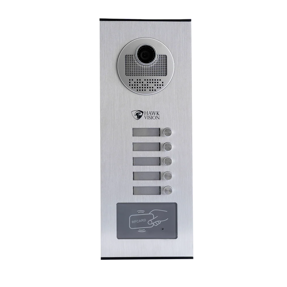 The Hawkvision HV-D4-5-OU is a high-performance 5-bell outdoor unit optimized for multi-apartment, multi-flat, or small residential/commercial buildings in video door phone systems. This super slim video door phone outdoor station incorporates RFID function for up to 1000 users (cards/fobs for fast, keyless entry), paired with a sharp IR CMOS camera (1MP resolution or 900 TVL color for clear video transmission to indoor monitors). It supports two-way communication for real-time visitor interaction, remote door release, and reliable monitoring from every apartment.