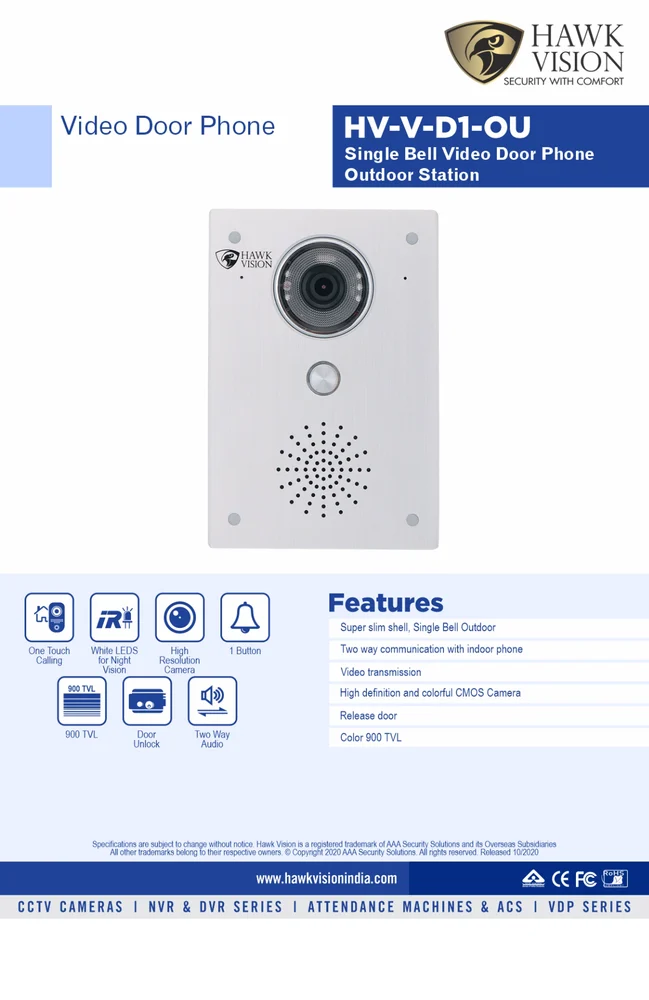 The Hawkvision HV-V-D1-OU is a compact single bell outdoor unit for analog video door phone systems, perfect for homes, offices, villas, apartments, or small gates. This super slim video door phone outdoor station features a high-quality IR CMOS camera (900 TVL color or 1MP resolution) for clear video transmission to indoor monitors, enabling sharp visitor identification day or night. It supports two-way communication for real-time audio talk, remote door release function, and reliable monitoring at your doorstep.