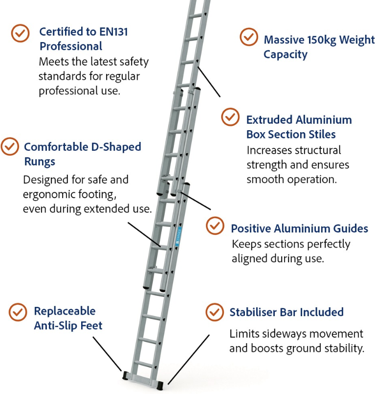 This robust ladder features 13 anti-slip steps spaced 30cm apart, with a maximum extended height of 3.8m and a folded length of just 87cm for ultimate portability—weighing only about 10-12kg. Engineered for safety, it includes sturdy side rails, secure locking pins, and non-slip feet to grip various surfaces like concrete, grass, or indoors. Ideal for painting, gutter cleaning, roof access, or electrical work, this EN131-certified ladder