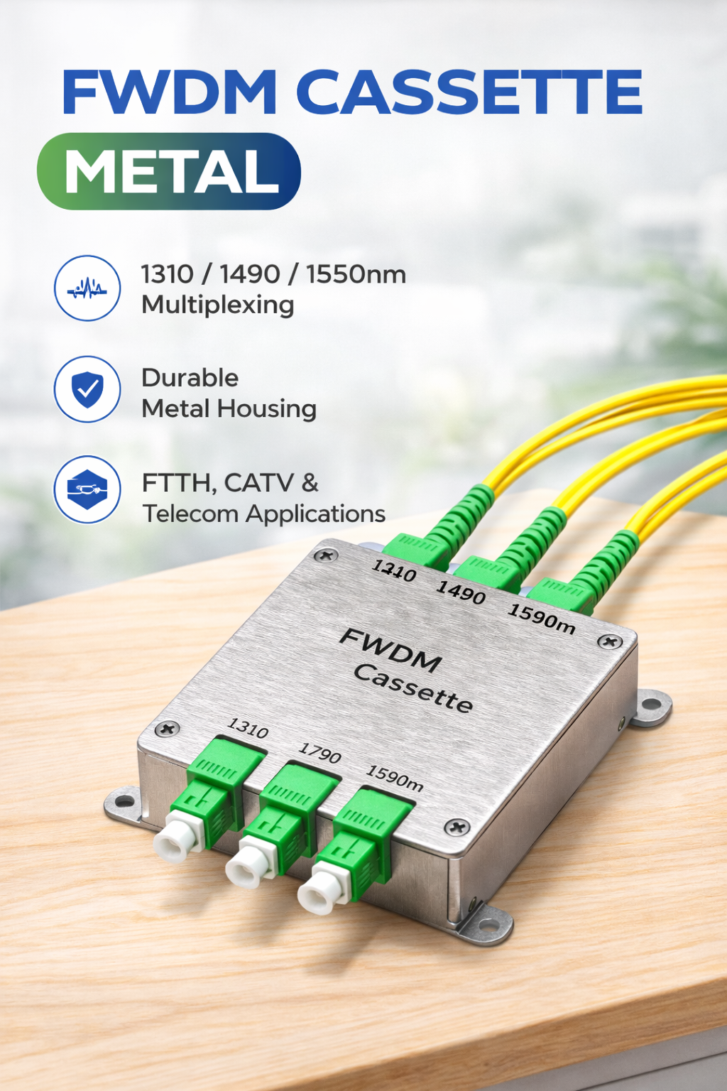 The FWDM Cassette Metal is an advanced fiber optic solution engineered for wavelength division multiplexing in modern communication networks. It supports multiple wavelengths such as 1310nm, 1490nm, and 1550nm, enabling simultaneous data transmission over a single optical fiber. This helps optimize network capacity while minimizing fiber usage and installation costs.