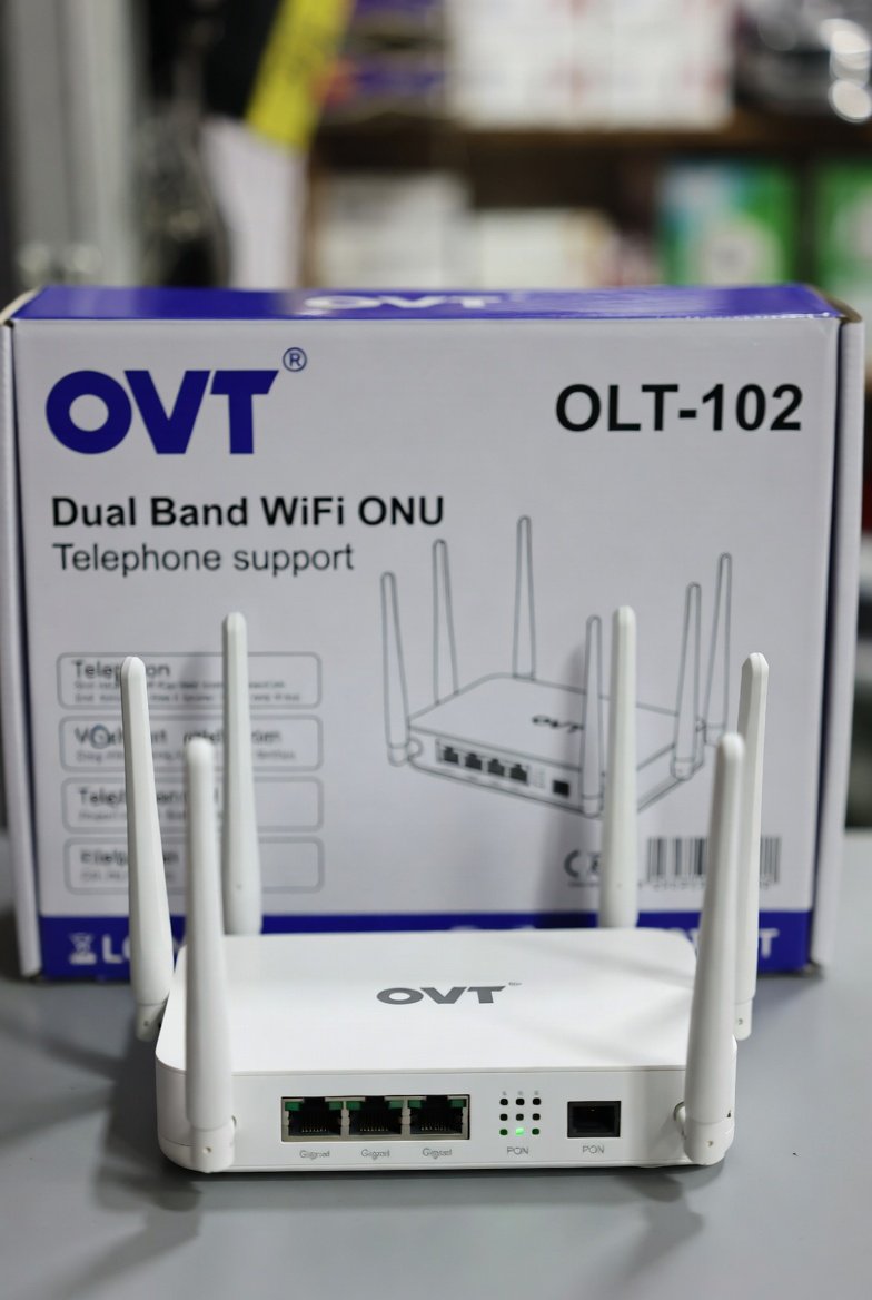 The OVT ONU + WiFi + Telephone Dual Band is an advanced fiber optic networking solution designed for FTTH (Fiber to the Home) deployments. It functions as an Optical Network Unit (ONU) that converts optical signals into high-speed internet, while also providing dual-band WiFi and VoIP telephone connectivity.