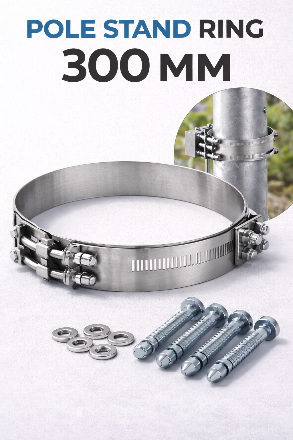 The 300 mm Pole Stand Ring is a robust and reliable solution for mounting CCTV cameras and accessories onto large poles and vertical structures. Designed for heavy-duty applications, it provides a firm and vibration-free hold, ensuring stable camera positioning for clear surveillance.