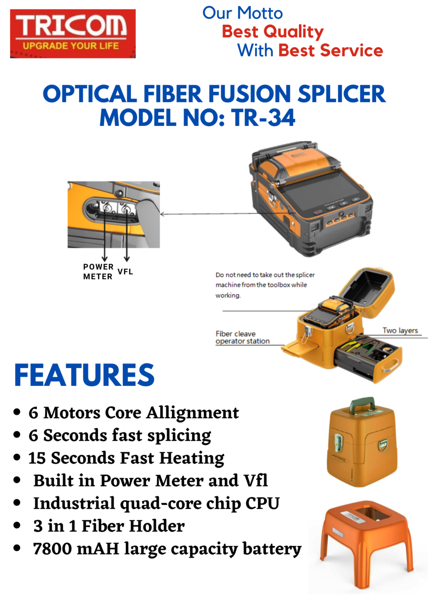 The TRICOM Fiber Optic Slicing Machine TR-34 is a high-precision tool designed for cutting and preparing optical fibers for splicing and connectorization. Engineered for professional fiber optic installations, it ensures clean, straight cuts with minimal fiber damage, which is essential for maintaining low signal loss in fiber networks.