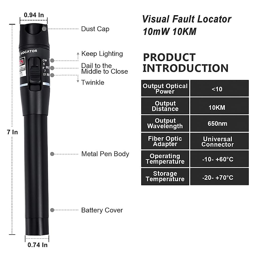 The TRICOM VFL 10KM Visual Fault Locator is a reliable fiber optic testing tool designed to quickly detect faults, breaks, and bends in fiber optic cables. With a powerful 10KM detection range, this device emits a bright red laser light that helps technicians easily identify fiber faults and connectivity issues during installation and maintenance.